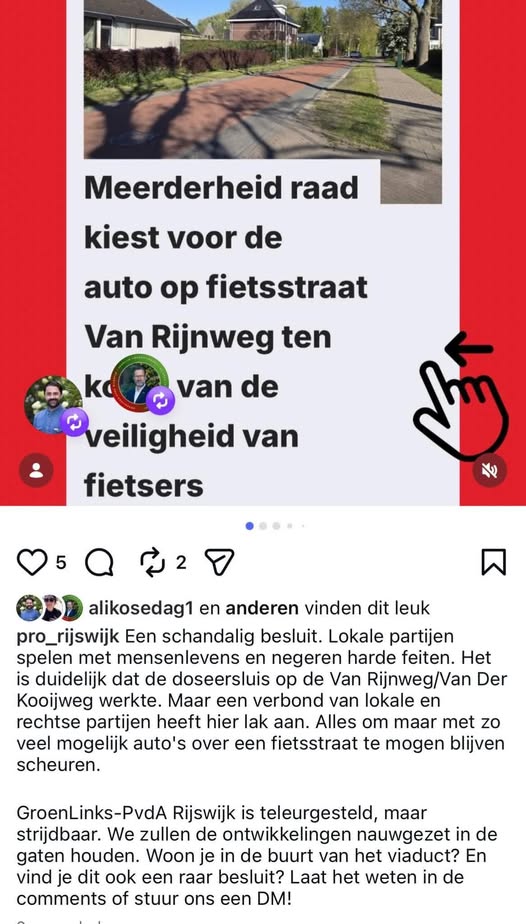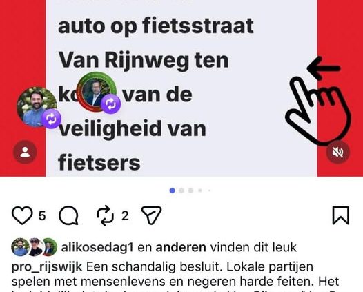 De situatie op de Van Rijnweg vraagt om een gebalanceerde aanpak. Daarbij wegen we verkeersveiligheid, bereikbaarheid en de ervaringen van omwonenden allemaal mee. Het is te makkelijk om dit neer te zetten als een keuze “tegen fietsers”; zo werkt het niet.