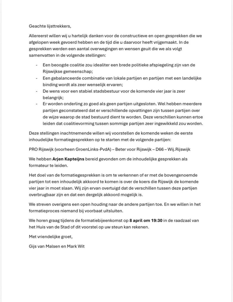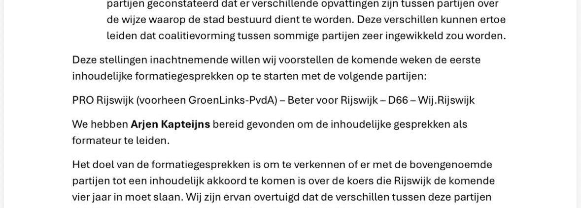 Hoewel de voorgestelde richting niet aansluit bij onze voorkeursvariant, benadrukken wij dat Beter voor Rijswijk niemand uitsluit. Wij staan open voor vervolggesprekken en zullen deze, zoals altijd, constructief en in het belang van Rijswijk voeren.